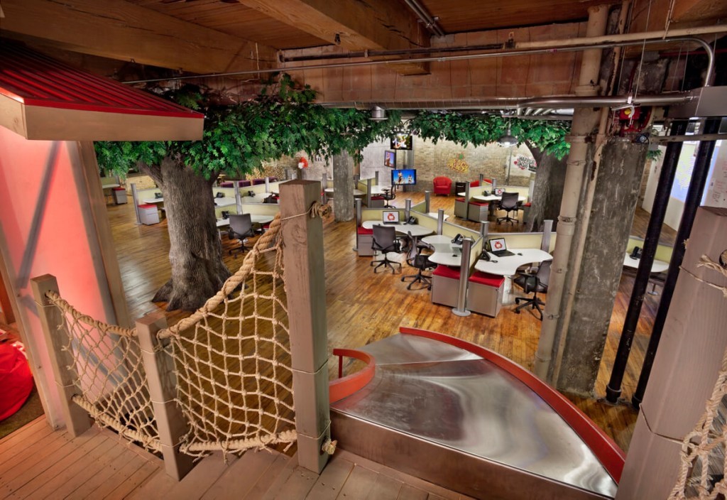 Red Frog Events คือบริษัทที่จัดอีเว้นท์ในสเกลขนาดใหญ่ มีสำนักงานใหญ่อยู่ในมหานครชิคาโก ประเทศสหรัฐอเมริกา ออฟฟิศแห่งนี้จะเรียกความสดใสของคุณกลับคืนมา เพราะพวกเขามีสไลเดอร์ ต้นไม้กลางออฟฟิศ และมุมนั่งเล่นน่ารักๆให้พนักงานได้คุยกัน ถ้าเกิดคุณคิดงานไม่ออกมาพักใหญ่ ลองไปเล่นสไลเดอร์ดูสักสองสามรอบ ไอเดียอาจจะโลดแล่นขึ้นมาก็เป็นได้