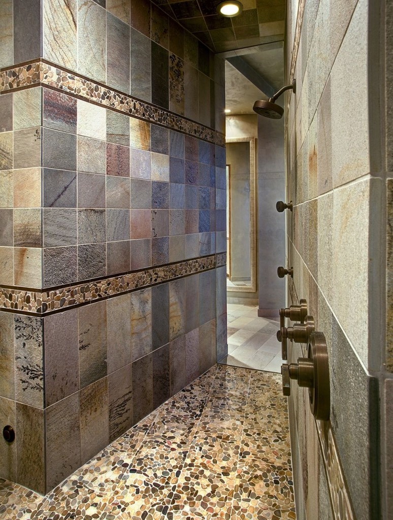 การปูกระเบื้องเซรามิกที่เป็นลายสีเป็นลวดลายสีเหลี่ยมจตุหลัก พร้อมโทนสีที่มีความเข้มอ่อนไม่เท่ากันในแต่ละจุด ถือเป็นอีกหนึ่งรูปแบบของกระเบื้องห้องน้ำที่เป็นที่นิยมมากที่สุด เนื่องจากลวดลายและวัสดุหาได้ง่ายและมีราคาไม่แพงมาก อีกทั้งยังสามารถปูได้ทั้งผนัง พื้น และส่วนอื่นๆ ของห้องน้ำได้อย่างไม่มีปัญหา โดยส่วนใหญ่การตกแต่งห้องน้ำด้วยกระเบื้องลวดลายนี้จะไม่เน้นสีอ่อนเนื่องจากจะเกิดความสกปรกได้ง่ายจากรอยต่อของกระเบื้องเซรามิกชนิดนี้ ดังนั้นคนส่วนใหญ่จึงเลือกใช้สีเข้ม และสร้างมิติให้ห้องน้ำด้วยการเลือกสีโทนเข้มที่แตกต่างกันไม่มากกว่า 2 สีเท่านั้น
