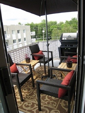 การเลือกใช้อุปกรณ์ปูพื้นเช่นพรมกลางแจ้งหรือแผ่นไม้เชื่อมแบบ inter-locking นอกจากจะช่วยปกปิดพื้นคอนกรีตที่แข็งกระด้างแล้ว ยังสร้างความน่าดึงดูดให้ระเบียงของเราอีกด้วยค่ะ